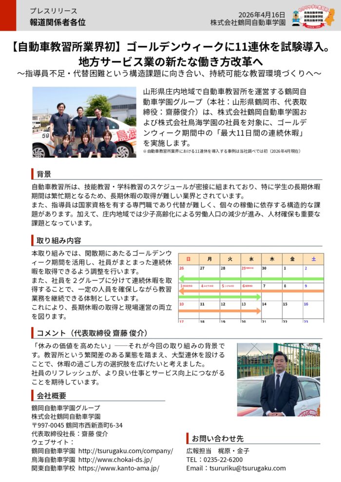 山形県庄内地域で自動車教習所を運営する鶴岡自動車学園グループ(本社:山形県鶴岡市、代表取締役:齋藤俊介)は、株式会社鶴岡自動車学園および株式会社鳥海学園の社員を対象とした「11日間の連続休暇」を試験的に実施します。